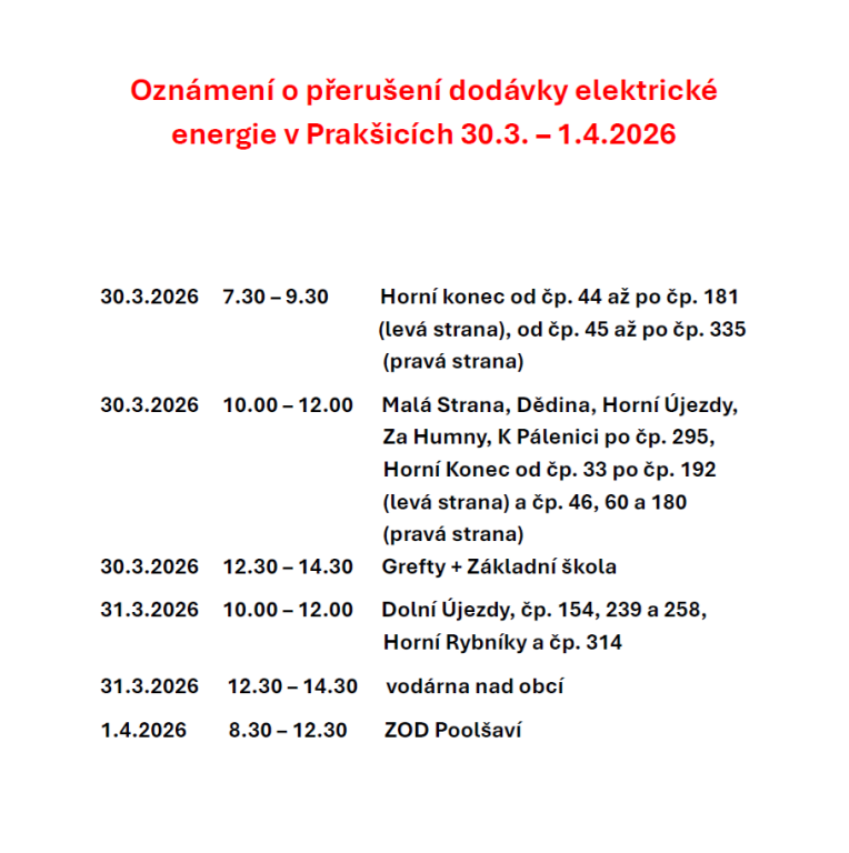 Oznámení o přerušení dodávky elektrické energie 30.3. - 1.4.2026